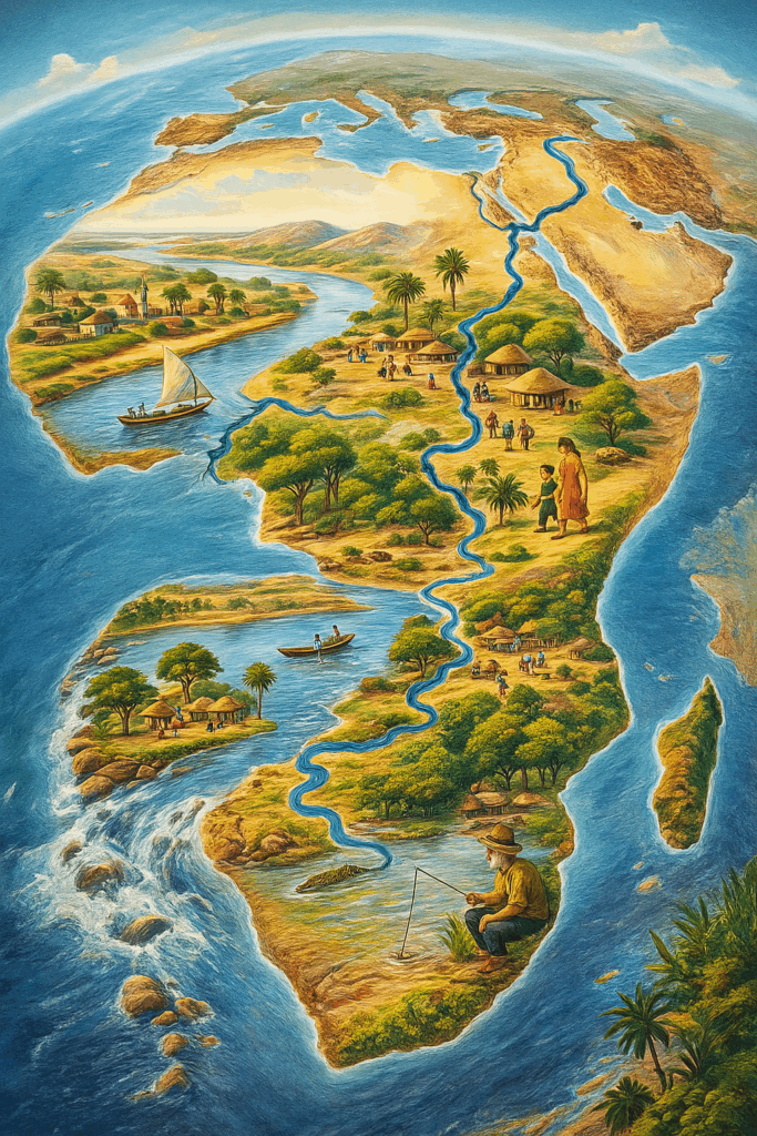 über Jahrtausende Kulturen, Handel und Reisende leiten . Eine erzählerische Reise entlang der Flusssysteme, die den Kontinent formen – von den Mythen des Nil bis zu den Handelsrouten des Niger und den Zukunftsfragen am Kongo.